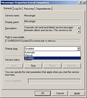 3. Right-click on the Messenger entry and choose Properties. A dialog box will appear; select "Disabled" from the "Startup Type" dropdown box, and then click the "Stop" button: