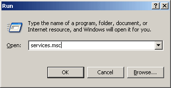 1. Click on your Start button, then type services.msc into the Run box as shown: